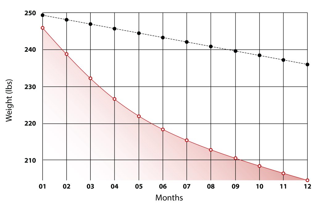 Weight loss over 12 months: Starting weight 250 lbs